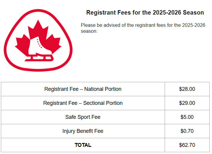 2025-2026 Skate Canada Membership Fees are provided below. These mandatory membership fees are collected on your behalf and paid directly to Skate Canada. These fees are only paid once per season and are valid between September 1 and August 31. To access your Skate Canada membership account, please visit: https://members.skatecanada.ca